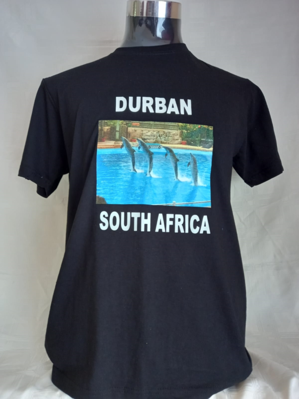 Black Durban T Shirt Digital Print including t/shirt. Writing done with video flex and picture done with printable vinyl.